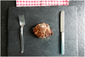 A minimalist flat lay of a steak with fork and knife on a slate board.