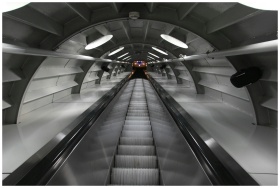 A sleek and modern underground escalator tunnel wi