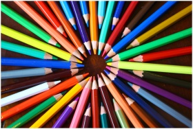 Vibrant spiral of colored pencils forming a rainbo