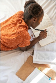 A woman studying and writing in a cozy indoor sett