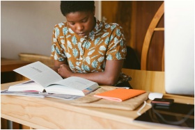 A young woman studies a book at her desk in a warm