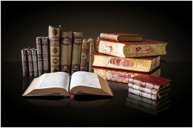 A collection of vintage books displayed elegantly on a reflective surface, ideal for education and literature themes.