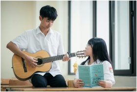 Two teenagers in a classroom: one playing guitar,