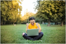 A young man in yellow celebrates success on his laptop while sitting in a sunlit park.