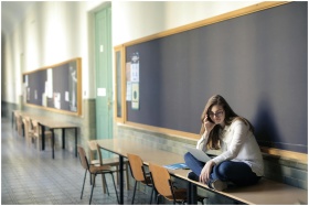 A woman sits on a desk in a university hallway, studying on a laptop.