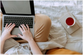 Top view anonymous remote worker typing on keyboard of laptop with blank screen while sitting with crossed legs on bed with tea aside at home