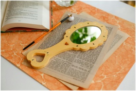 Elegant desk arrangement featuring a mirror, open book, and writing tools for an artistic flair.