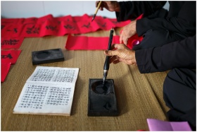Close-up of adults practicing calligraphy on bambo