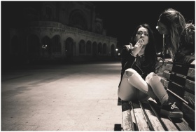 Two women converse on a city bench at night, expre