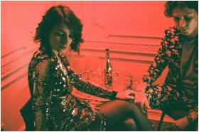 A stylish couple in glittering evening attire enjoying a night out at a chic nightclub.