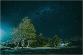 A breathtaking view of a starry sky above a tranquil forest landscape at night.