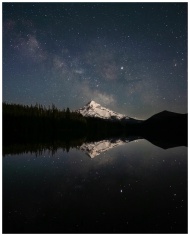 Snow-capped Mount Hood reflected in a serene lake under a starry sky, Oregon.