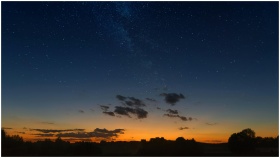 Captivating starry night sky over a silhouette landscape at vibrant sunset.