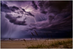 Dramatic lightning bolts illuminate the night sky over Redington Beach, creating a stunning natural scene.