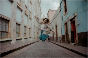 A stylish woman jumps joyfully in a vibrant city street, showcasing urban fashion.