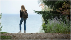 A young woman with a backpack stands on a scenic nature path overlooking a lake.