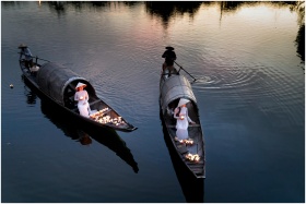 Serene river scene with traditional boats and glow