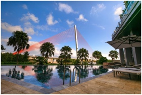 Relax at a luxurious resort poolside with scenic views of palm trees and an iconic bridge.