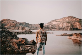 A man in a patterned shirt stands by a rocky lake, enjoying the serene summer view.