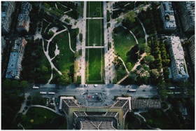 Stunning aerial view of the Eiffel Tower, Paris, showcasing the lush gardens and city streets below.