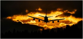 Airplane silhouette glides through a dramatic sunset sky, creating a striking aviation scene.