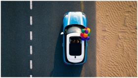 A Mini Cooper with colorful balloons drives along a desert road. Captured from above.
