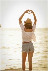 Woman in shorts and hat making a heart shape with her hands at sunset by the beach.