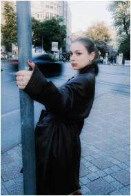 A fashionable woman in a dark trench coat holds a pole on a bustling city street. Urban lifestyle vibe.