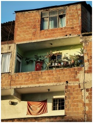 A brick apartment building with Turkish flags and a flower-adorned balcony.