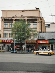Vibrant city street with local shops, a tree, and a passing taxi capturing urban life.
