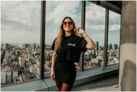 Stylish woman in sunglasses enjoys the view from a Buenos Aires skyscraper.