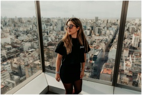 Stylish woman in sunglasses poses against a stunning Buenos Aires cityscape view from a high-rise.