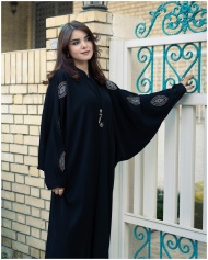 Stylish woman in black abaya poses by a decorative