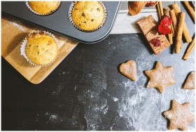 A delicious arrangement of muffins and cookies with cinnamon and flour on a black countertop.