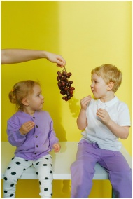 Two young children sitting indoors enjoying grapes against a bright yellow background.