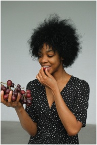 Portrait of a woman joyfully eating grapes. Perfect for healthy lifestyle themes.