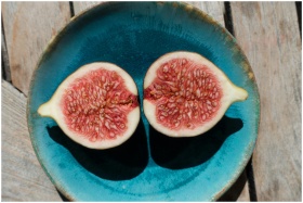 Close-up of a fresh ripe fig sliced in half on a v