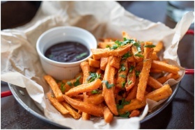 Close-up of crispy sweet potato fries garnished wi