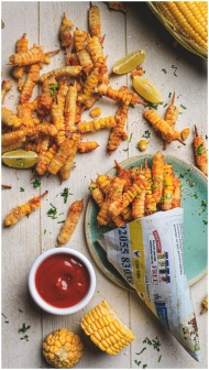 Delicious and crispy corn fries served with ketchup and lime wedges on a rustic table.
