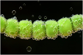 Close-up of green peas with bubbles suspended in water, showcasing freshness and texture.
