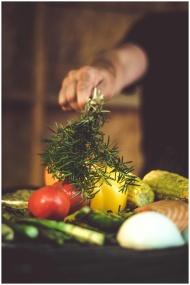 A vibrant assortment of fresh vegetables and herbs, including tomatoes and rosemary, being prepared for grilling.