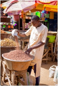 Man pouring grains in bustling market in KT, Nigeria, sunny day.