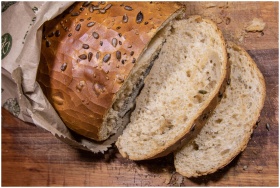 Close-up of sliced brown seeded bread on a rustic wooden cutting board with a paper bag.