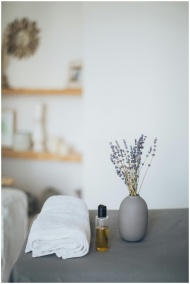 Relaxing spa scene featuring lavender, towel, and oil for a calming experience.