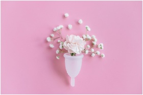 A menstrual cup filled with delicate flowers on a pink background, symbolizing feminine care and eco-friendly solutions.