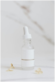 Elegant product photography of a glass serum bottl