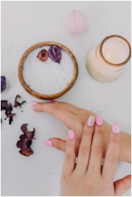 Beautiful pink manicure and spa products create a calming and luxurious experience.