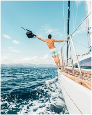 Man enjoying freedom by jumping into the ocean from a sailboat in Greece.