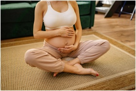 Expectant mother sitting in a serene setting practicing meditation and mindfulness indoors.