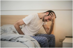 A young man in pajamas holding his head, sitting on a bed, appears to be experiencing a headache.